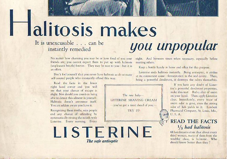 Porém, com o tempo, descobriu-se que LISTERINE era excelente e eficaz para matar as bactérias orais. Somente em 1895 as vendas foram estendidas aos dentistas, que indicavam o produto como elixir oral. Em 1914, o produto era tão popular, que se tornou um dos primeiros medicamentos com prescrição a estar disponível em quase todo território americano, criando o segmento de anti-sépticos orais do país. Nessa mesma época, Gerard, filho do fundador da empresa, mudou o posicionamento do produto: uma solução eficaz contra a “halitose crônica” – então um obscuro termo médico utilizado para designar o mau hálito. Até então, o mau hálito não era considerado um problema sério, facto que mudou radicalmente com o novo posicionamento do produto. Os novos anúncios do produto mostravam casais jovens, ansiosos para casar, mas que perdiam essa vontade diante do fétido hálito de seus parceiros.