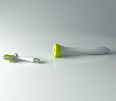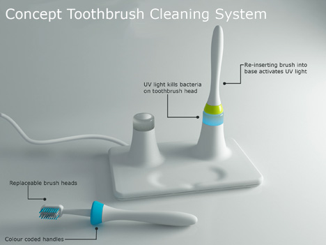 Há pouco tempo falei sobre a manutenção da escova de dentes e afirmei que a escova deve estar afastada da sanita devido às partículas libertadas após as descargas… isto dá que pensar. Graças a estes pensamentos o Designer Chris Anderson decidiu desehar uma escova que assim que é colocada no suporte da escova de dentes é esterilizada através de Ultra Violetas.