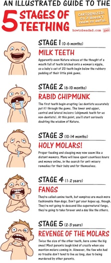 Todos nós conhecemos a dificuldade dos pais com os filhos bebés quando os dentes começam a erupcionar . Este poster mostra com algum humos os 5 estágios da criança.