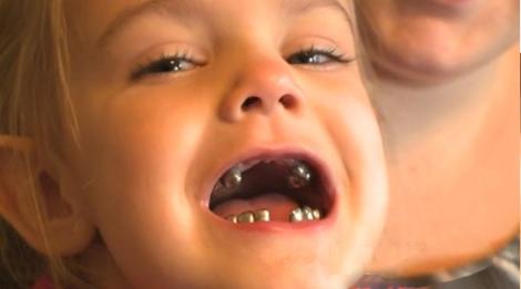 Quando Savannah acordou, a mãe descobriu que todos os dentes tinham sido cobertas com coroas metálicas.