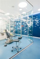 O objetivo do projeto do escritório Kinderdentist era criar a sensação de um mundo subaquático. Além do tom laranja ocasional como parte do seu logotipo (e um tema recorrente), as únicas cores do escritório são aquáticos – principalmente azuis e pratas. Dr. Mokabberi e seus parceiros dentários queriam criar uma sensação diferente para o seu consultório. Eles não gostaram da esterilidade de paredes brancas de um consultório de dentista típico, então eles foram aquático.