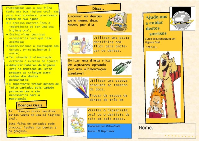 Uma grande parte do trabalho de um Higienista Oral passa pela informação passada aos pacientes sobre a saúde Oral e por isso deixo um pequeno folheto sobre a mesma que elaborei nos meus tempos de Faculdade…