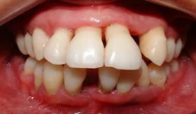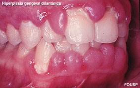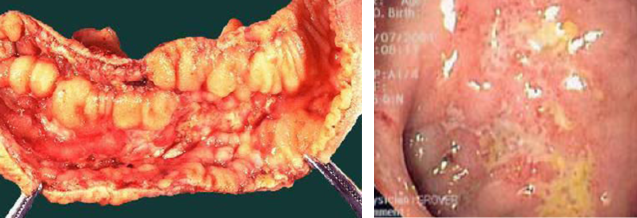 A mucosa afectada está hiperemiada e com focos de ulceração.