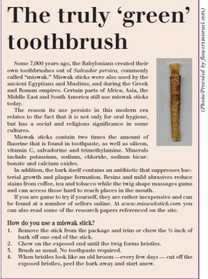Os primeiros traços da escova de dentes datam de 3500 A.C. e pensa-se pertencer aos Egípcios e aos Babilónios. Estas civilizações utilizavam uma espécie de “pau para mastigar”,em que a permanente mastigação de uma das extremidades formava umas fibras de madeira que eram utilizadas para lavar os dentes. Estes pequenos pedaços de madeira eram feitas através de ramos de Salvadora Persica que se pensava terem propriedades curativas e antisépticas.