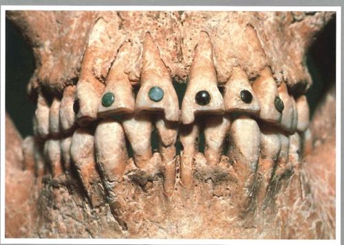 – 900 – 300A.C. América do Sul. Os Maias procederam à colocação de pedras semi-preciosas, como Jade, nos dentes como razão estética e cultural;